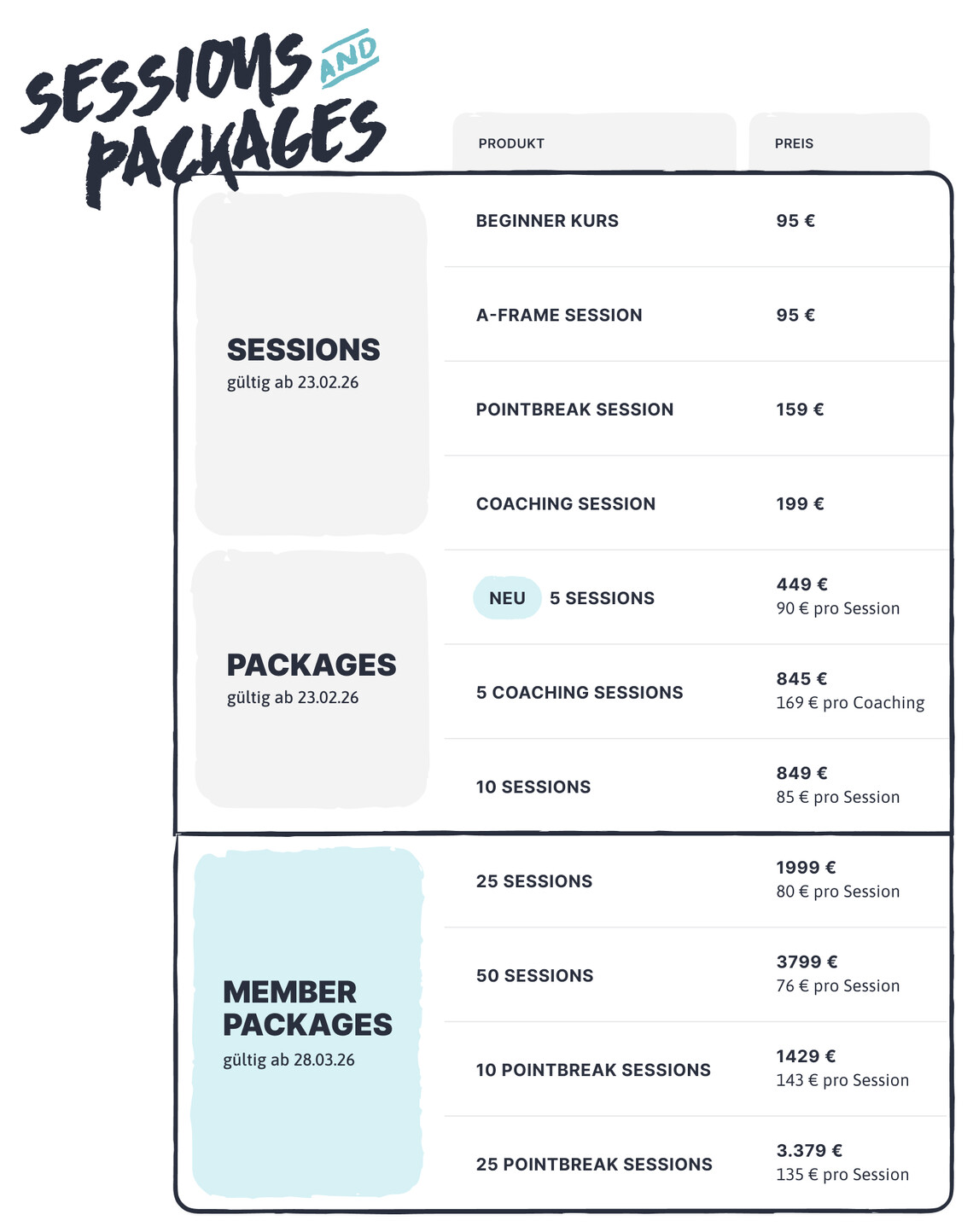 Für alle, die regelmäßig bei uns surfen, ändert sich nichts: Mit dem neuen 5er Package bleibt euer Sessionpreis trotz Preisanpassung auf dem bisherigen Niveau.