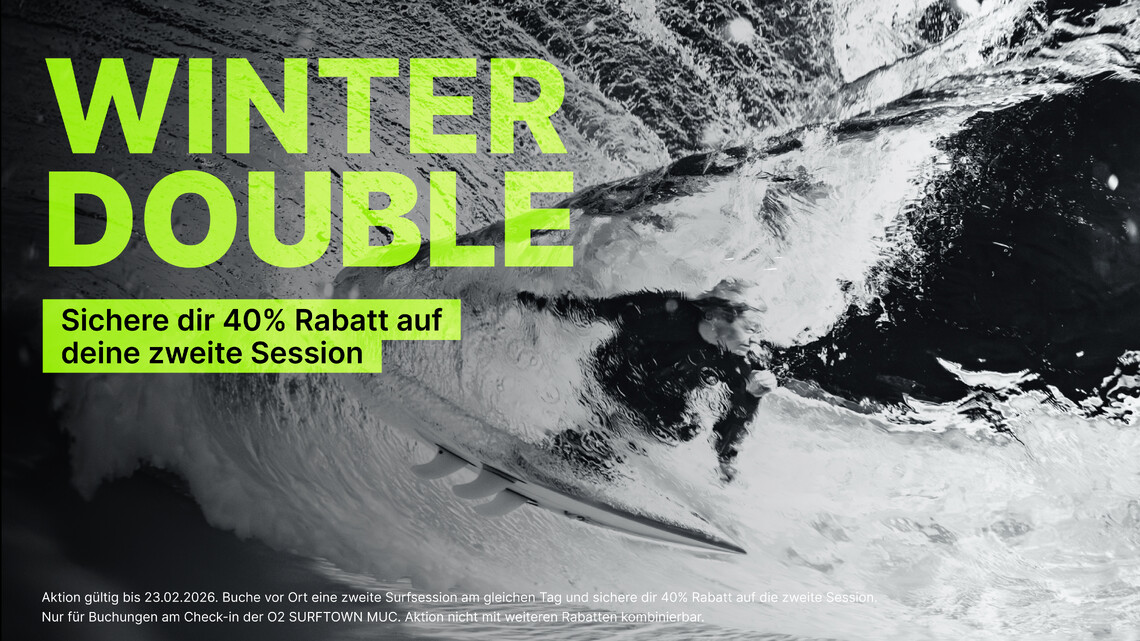 Aktion gültig von 26.12.2025 bis 23.02.2026 und nur für Buchungen am Check-in der O2 SURFTOWN MUC. Aktion nicht mit weiteren Rabatten kombinierbar